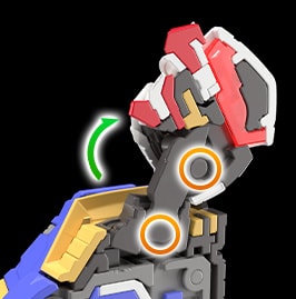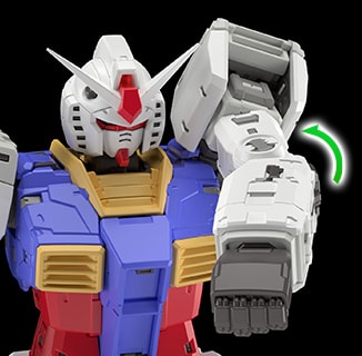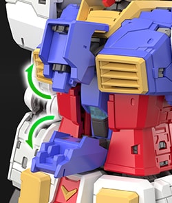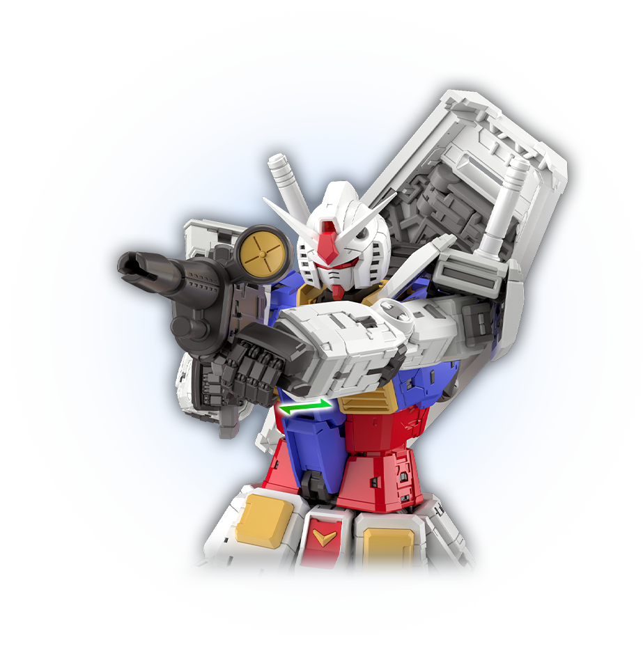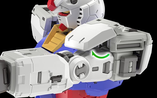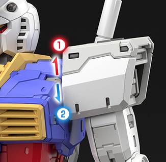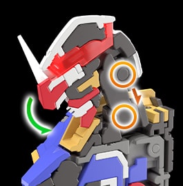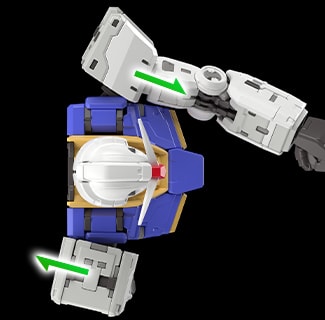 肩甲采用可向前展开的结构。当手臂向前抬起时,可如剧中呈现的画面,将装甲朝向前方,并伸出手臂。可以摆出体现高达设计感的注目姿势,享受其中乐趣。