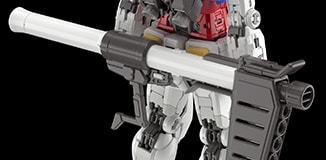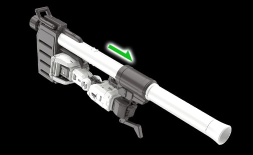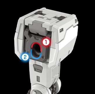 光束步枪的直角握把可通过枪身的回转轴移动。将握把朝侧面抬起,即可还原剧中的双手持枪姿势。 RG Ver.2.0更添加了前后可动的握把结构,可以更自由地做出动作。