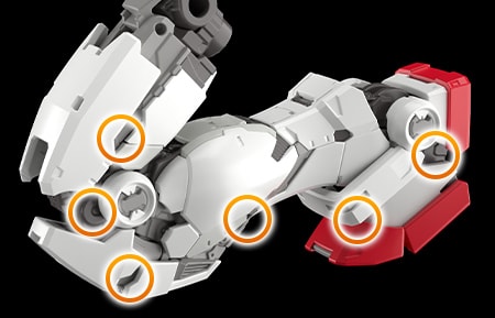 依据设定,肘部或膝盖等部位的可动关节皆以圆柱型零件为轴心。为了重新诠释该关节结构并扩大可动范围,过往的高达模型中多半会刻意剔除此类设定。本次借由本商品回归原点,我们采用了通过旋转来组装的新关节结构「转向关节」,确保充足的可动范围,并且以圆柱型零件的位置为轴心。