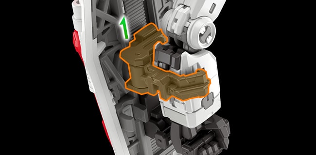 侧裙甲/后裙甲零件,采用了将其根部夹在外部装甲及骨架之间的锁定结构。此设计可防止零件脱落并提升模型的可动性。
